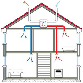 At the same time, fresh cool air from outside is brought into the Mechanical Ventilation Heat Recovery system where it gets warmed and then distributed (via ducting) to the home’s occupied rooms (bedrooms, living room, study, lounge etc.).